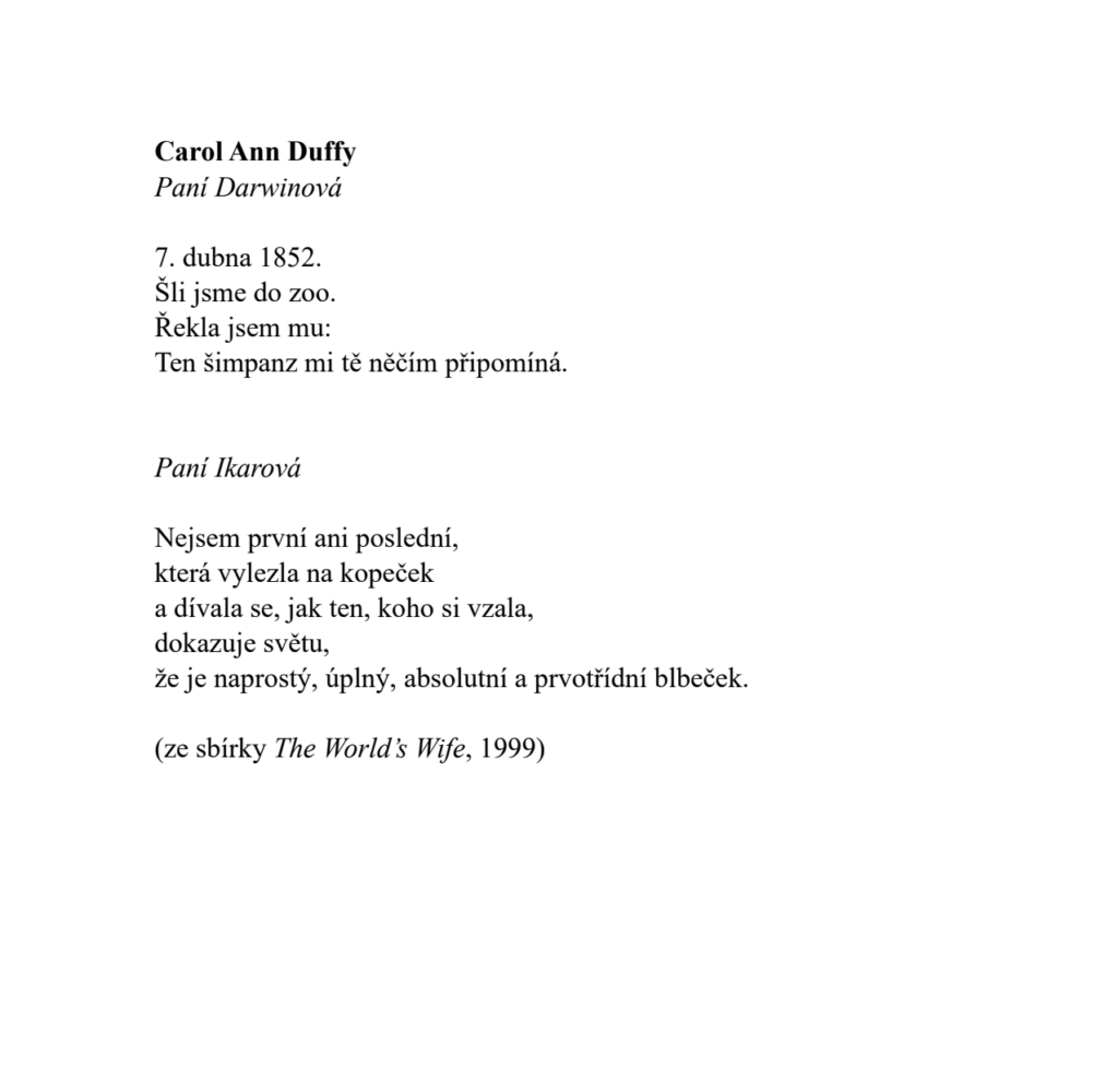 V nasledujúcom výbere prinášame preklady básní škótskej poetky a dramatičky Carol Ann Duffy, na ktorých počas januárovej rezidencie pracovala česká prekladateľka akademických textov a kníh o etike, filozofii a histórii Sylva Ficová. Básne dopĺňajú osobné postrehy z jej rezidenčnej každodennosti — vždy trochu zvláštneho času, kedy sa rezidentka stáva dočasnou obyvateľkou Košíc