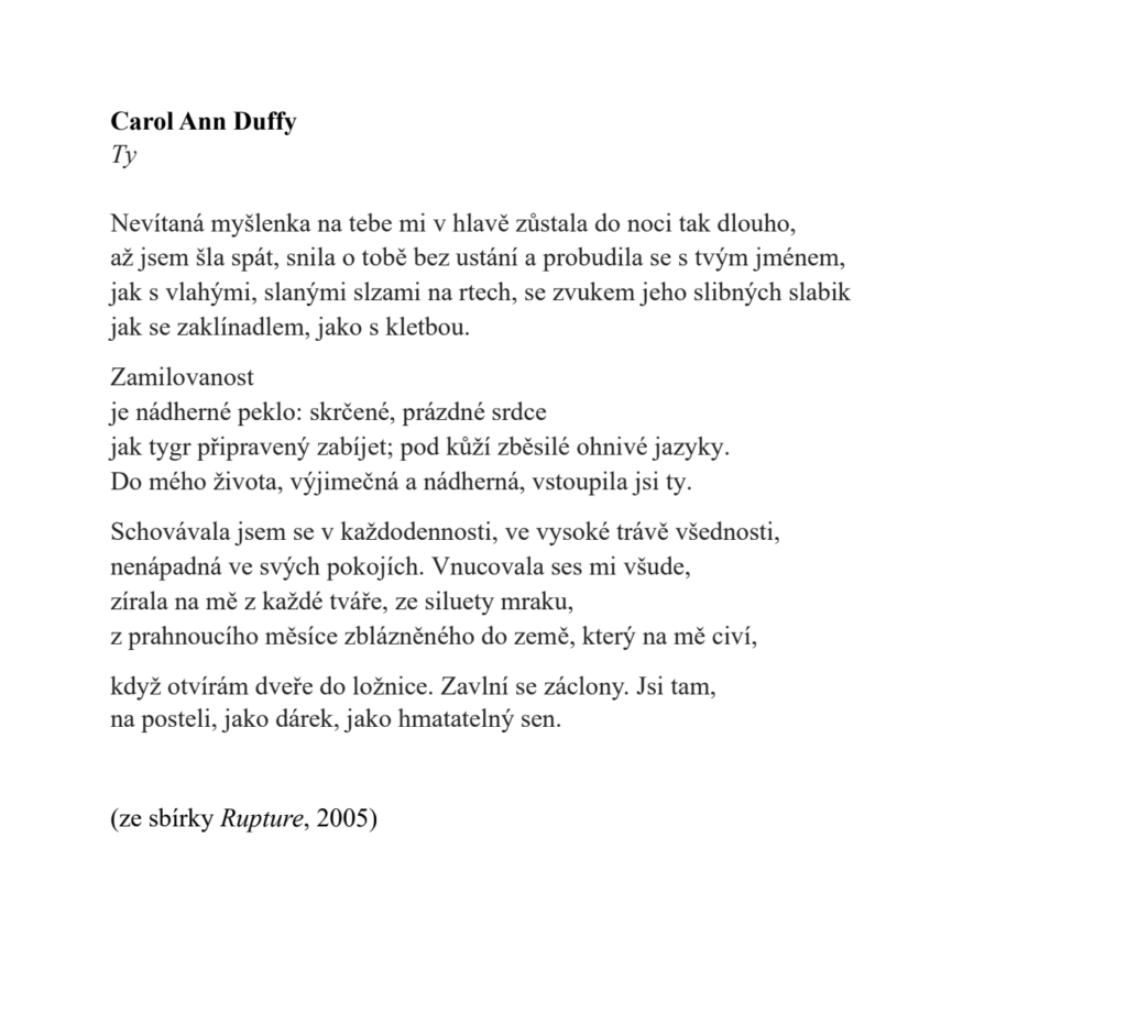 V roce 2009, dva roky po vydání druhého „sešitu“, byla Carol Ann Duffy jmenována královskou básnířkou (poet laureate) jako první žena a první Skotka vůbec a během svého desetiletého působení se často objevovala nejen v britské televizi a rozhlasu, ale i v britských učebnicích literatury. I proto dnes některé závěry v doslovu k prvnímu slovenskému výboru a některá překladová řešení znějí trochu nepatřičně až zastarale. Není divu: zralejší a otevřenější milostné básně této autorky tehdy měly teprve přijít.