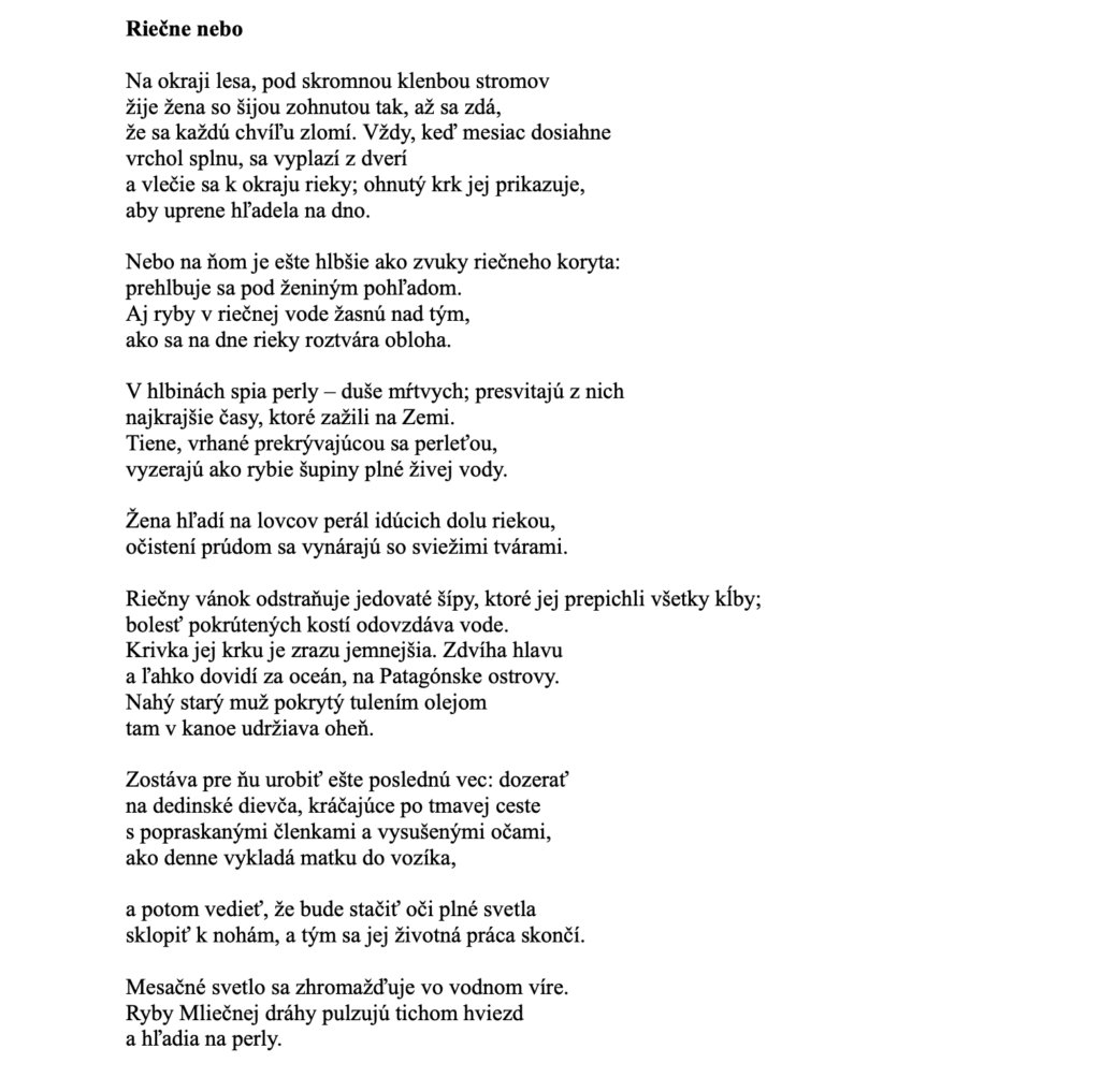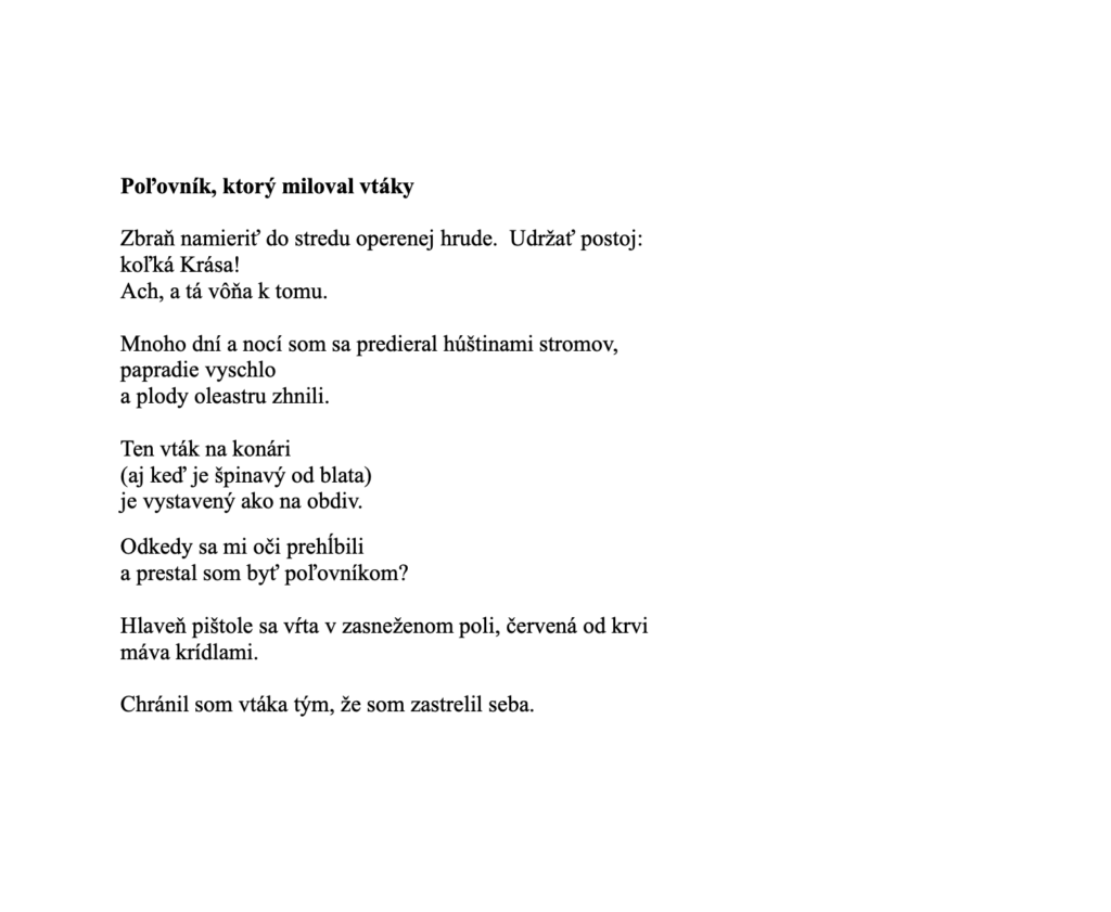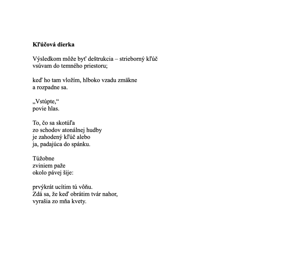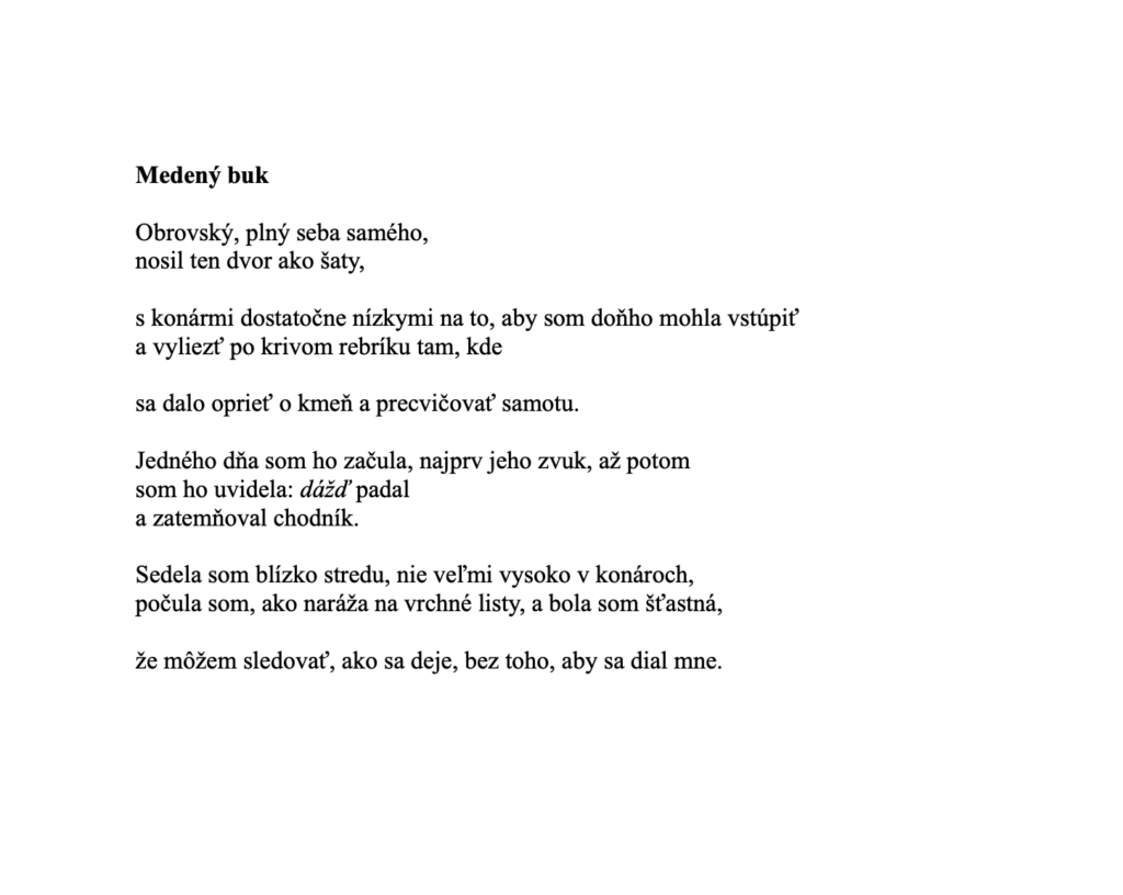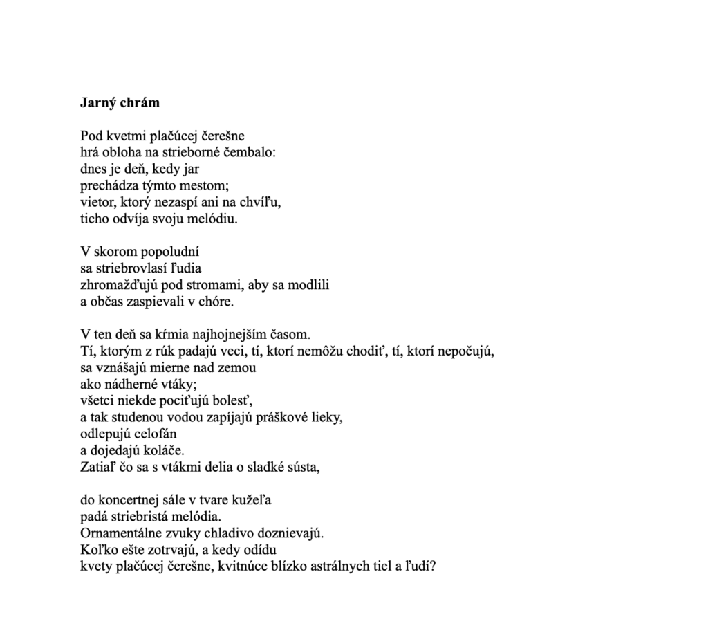 Ale! Podarilo sa mi pohnúť s prekladmi zahraničnej poézie. Podľa mojich prekladateľských skúseností najťažšie zo všetkého je prekladať poéziu – zvlášť z japončiny! Na budúci rok by mal vo vydavateľstve Modrý Peter vyjsť výber z poézie úžasnej japonskej poetky Čijo Kitahary, na ktorý sa veľmi teším, ale je to aj namáhavé a zložité, vyžaduje to veľa konzultácií s autorkou, ideme spolu cez každý verš, každú metaforu. Pani Čijo je nesmierne trpezlivá a ochotná, venuje sa každej mojej otázke, aj tej najprimitívnejšej (ja si rada overujem aj na prvý pohľad samozrejmé veci). Som veľmi rada a hrdá, že jej prvé básne môžem ponúknuť práve na tomto mieste, ako výsledok a ochutnávku, a zároveň ako poďakovanie za poskytnutú rezidenciu.