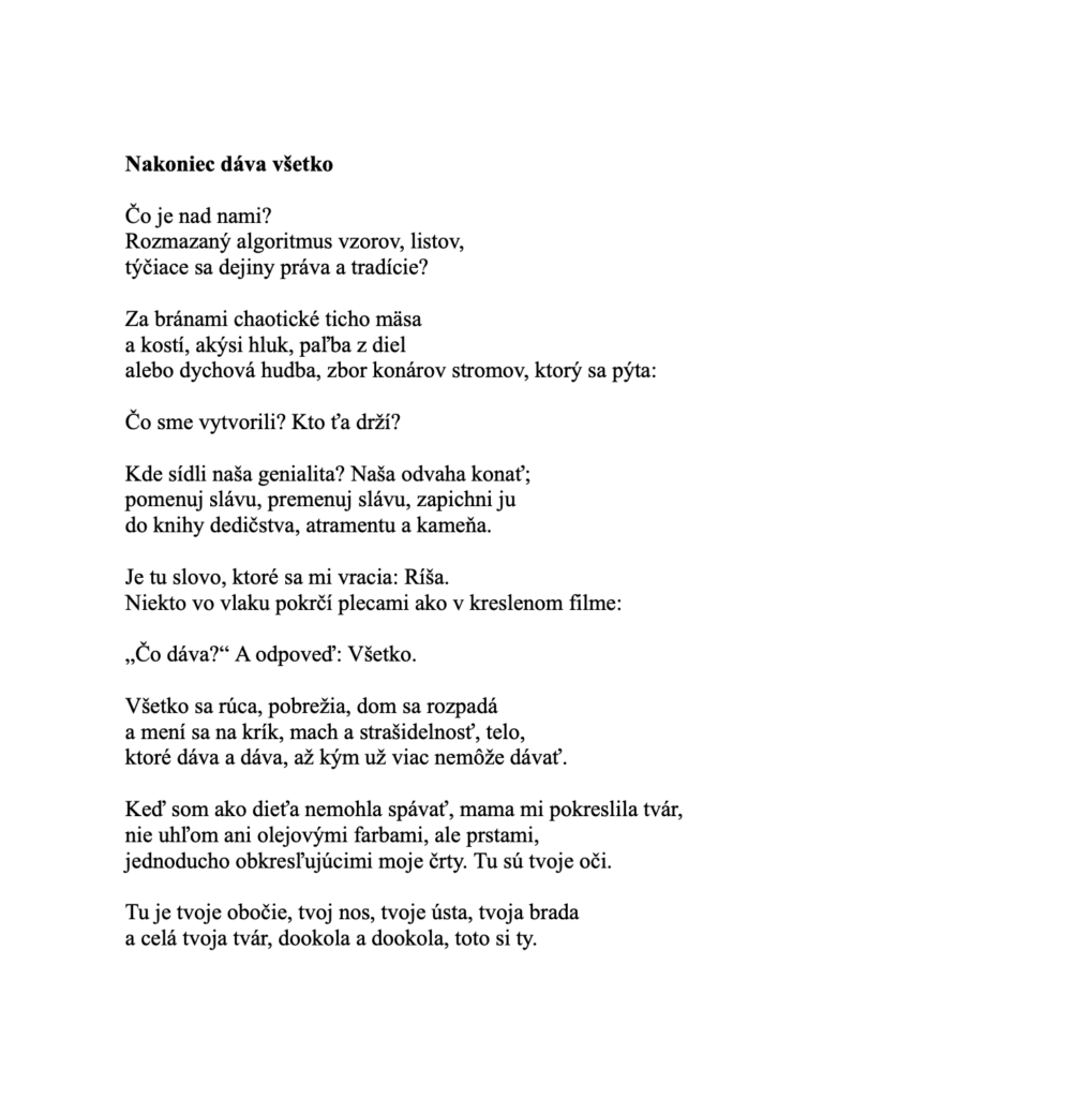 Tak som sa tešila aj na tohtoročný marec na rezidencii v Košiciach. Dúfala som, že za mnou prídu nové básne, ale to nie je nikdy zaručené. Nedávno mi vyšla zatiaľ posledná zbierka Nekromantik (Skalná ruža 2025), a po zbierke prichádzajú básne sporadicky. A predsa som odvtedy už napísala 5 nových básní, ktoré tu ale nemôžem predstaviť, pretože boli práve publikované v najnovšom čísle časopisu Romboid.